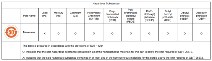 We, RONDA, confirm that the environmental protection use period (EPUP) of the above-mentioned products is 50 years. These products contain components made of homogeneous materials, in which lead (Pb) is present in a higher concentration than 0.1 percent by weight. These materials are found in alloys of steel and copper.