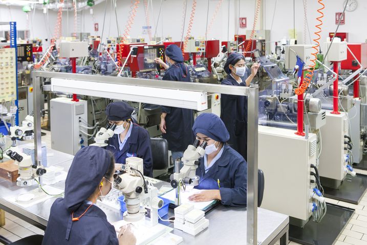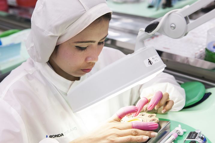Das Zusammensetzen der Swiss Parts Uhrwerke erfolgt auf halbautomatischen Montagelinien. Ronda Thailands Arbeitsmodell bietet eine hohe logistische Flexibilität, um schnell und kurzfristig auf sich ändernde Marktbedürfnisse reagieren zu können.